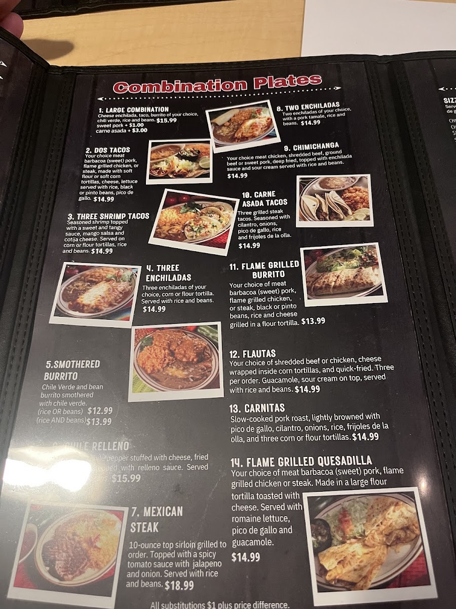 Cheese enchilada, taco, burrito of your choice, Chili Verde, rice, and bean. (Chile Verde, Chile Colorado, chicken, or shredded beef burritos add $.50 (Sweet pork add $1.00)